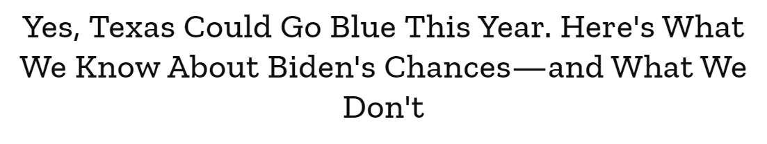 Then, on election night, Florida and Iowa went to Trump. Then, of course, Texas went to Trump because … have you ever been to Texas? Do these “journalists” know anything about it? Try going anywhere in Texas outside of Austin, Houston, or Dallas and tell me that these people will ever vote Democrat. They would vote Republican even if its candidate is a rock with sunglasses on.