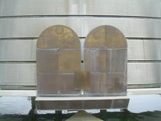 In front of the pyramid are two bronze tablets, which are very reminiscent of Moses’ 10 Commandments in shape, but engraved with astronomical and planetary glyphs instead of words. The rectangle slab of bronze uniting the two tablets bears the biggest accomplishment of modern illuminism: the Declaration of Human Rights.
