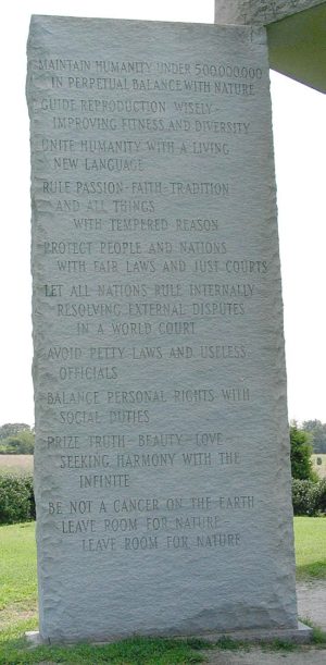 “In 1980, as these stones were being raised, the most pressing world problem was the need to control human numbers. In recent centuries technology and abundant fuels have made possible a multiplication of humanity far beyond what is prudent or long sustainable. Now we can foresee the impending exhaustion of those energy sources and the depletion of world reserves of many vital raw materials.