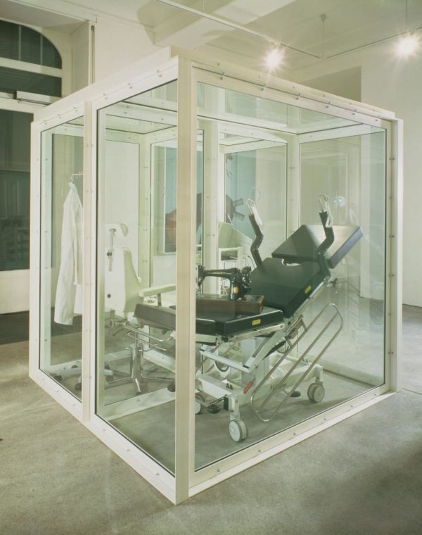 Hirst is also know for creating “vitrines”, which are usually made of an assortment of objects inside glass compartments. This one contains an operating table on which sits a sewing machine. What kind of horrific procedure is going on here?