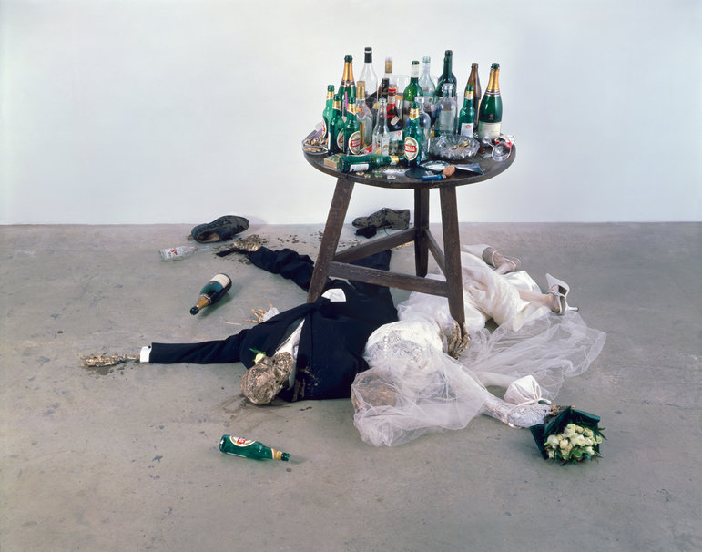 Adam and Eve Under the Table features two actual human skeletons laying on the floor under empty bottles and random garbage.