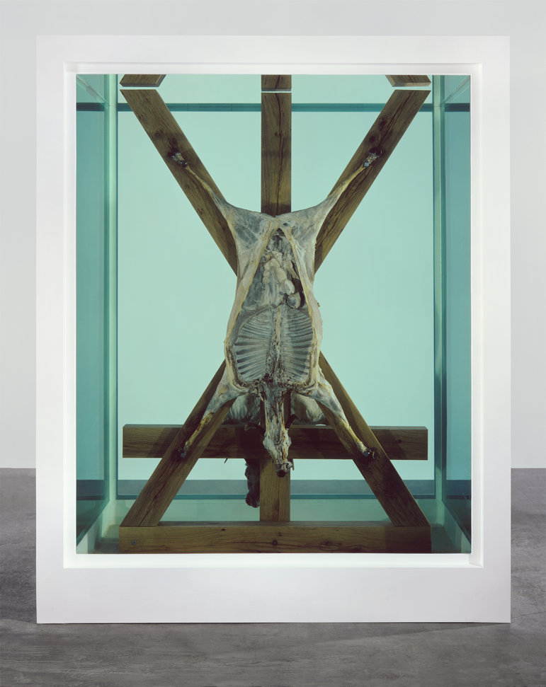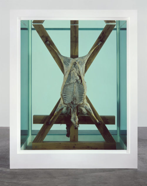 Right from the start of his career, Hirst’s works revolved around the theme of death. One of his first “works of art” is a picture of him smiling next to a severed head. He soon became famous for a series of artworks in which dead animals (including sharks, sheep, and cows) are preserved—sometimes having been dissected—in formaldehyde.