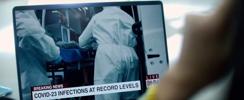 Then, we hear a newscaster talking about the “213th week of lockdown”, which means that the lockdown of 2020 never ended.