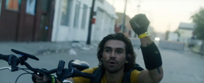 The movie’s protagonist flashes a wristband proving that he is immune to gas-masked soldiers patrolling the streets.
