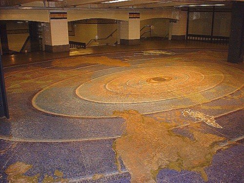 The centerpiece of the work is an elliptical glass and stone mosaic floor, with a micro mosaic eye at the center of an ultramarine vortex with the image of the City of New York woven into the picture. This All-Seeing Eye, placed right under the actual Ground Zero sends shockwaves around the world. Those of you who know the myth of the eye of Horus, where Osiris experiences a rebirth in the underworld, will surely find it interesting that this eye is located below ground level…in the “underworld”.