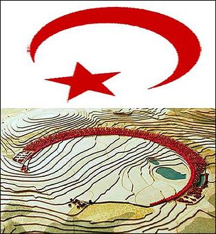 1. THE GIANT CRESCENT. The centerpiece of the original “Crescent of Embrace” design was a giant red Islamic shaped crescent. Every particle of this original crescent design remains completely intact in the so-called redesign, which only added a few irrelevant trees. The giant crescent is still there.