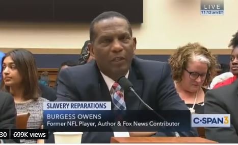 In June 2019 Burgess Owens called on the Democrat Party for the Democrat Party to be held accountable for reparations.