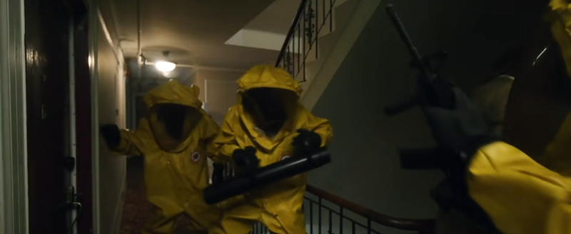 The movie’s protagonist flashes a wristband proving that he is immune to gas-masked soldiers patrolling the streets.